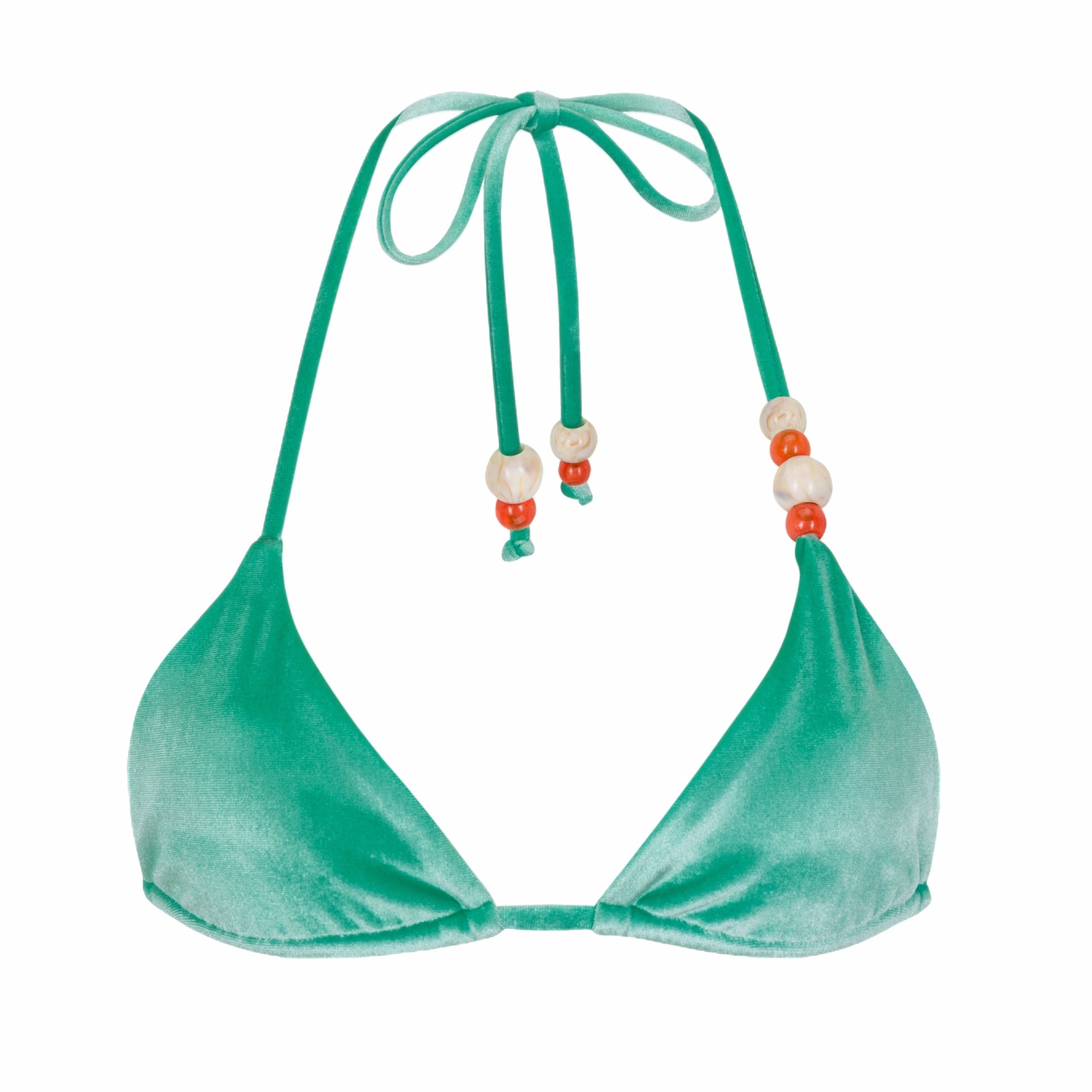 Beautiful emerald green velvet (100% water-friendly) paired with asymmetrical beads to give an earthy contrast - Triangle Top fully adjustable - want minimal tan lines? just move the beads to the strings and you won’t see them! Model is 5’9-34B and wears size Small