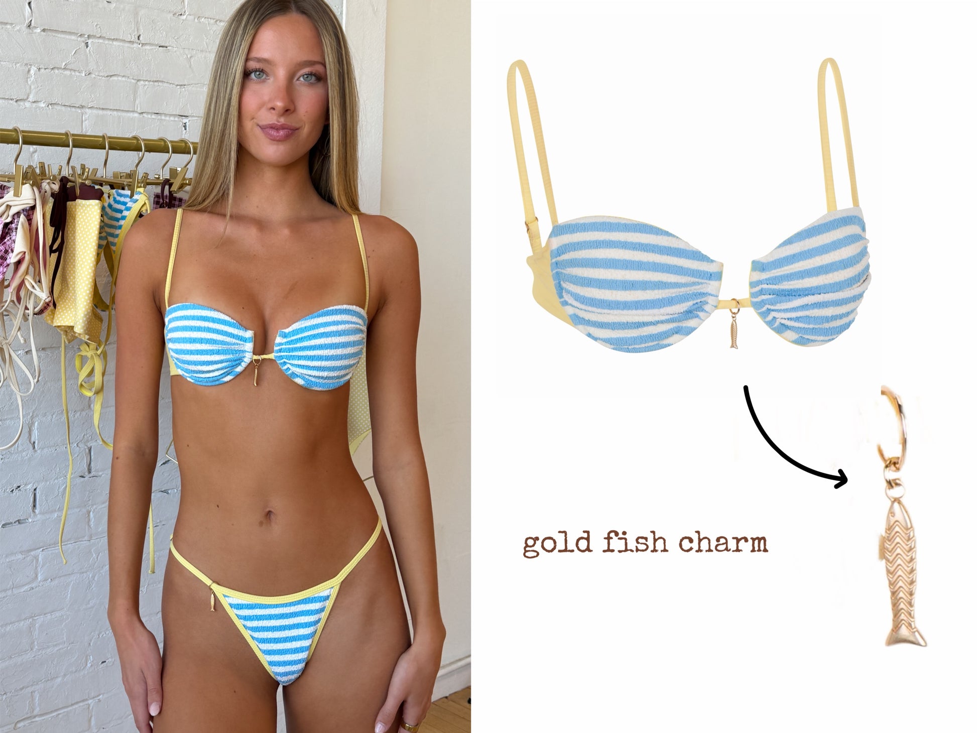 Customizable strap length and minimal tan lines. Finished with signature charms: a gold fish charm in one side.