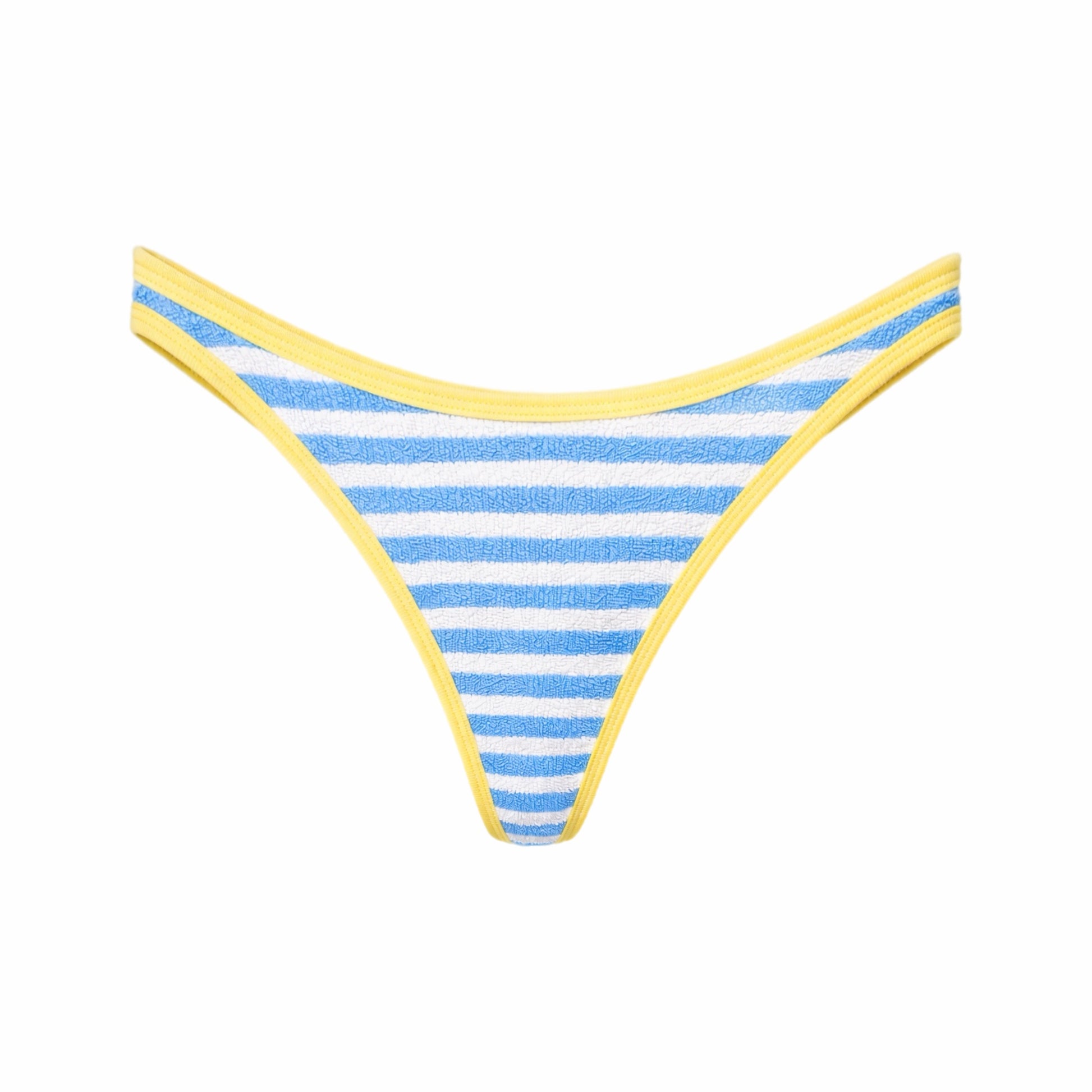 The Lemon Pie High-Cut bottoms are made for tanning and flattering curves. Crafted in our soft terry towel-inspired fabric with white and sky-blue stripes, they feel like your favorite beach towel but elevated. A pastel butter-yellow ribbed trim outlines the front and back for a soft contrast.