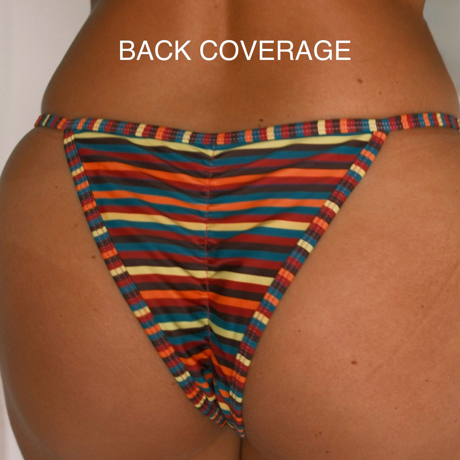 The Retro Bottoms are our classic minimal coverage cut — perfect for tanning days. Featuring adjustable ties on both sides so you can lengthen or shorten the straps to your liking. The subtle scrunch detail at the back adds a flattering touch, enhancing your natural shape. Wear them high on the hips or low on the waist — your call. Designed in our vibrant striped print that captures the spirit of technicolor summers.