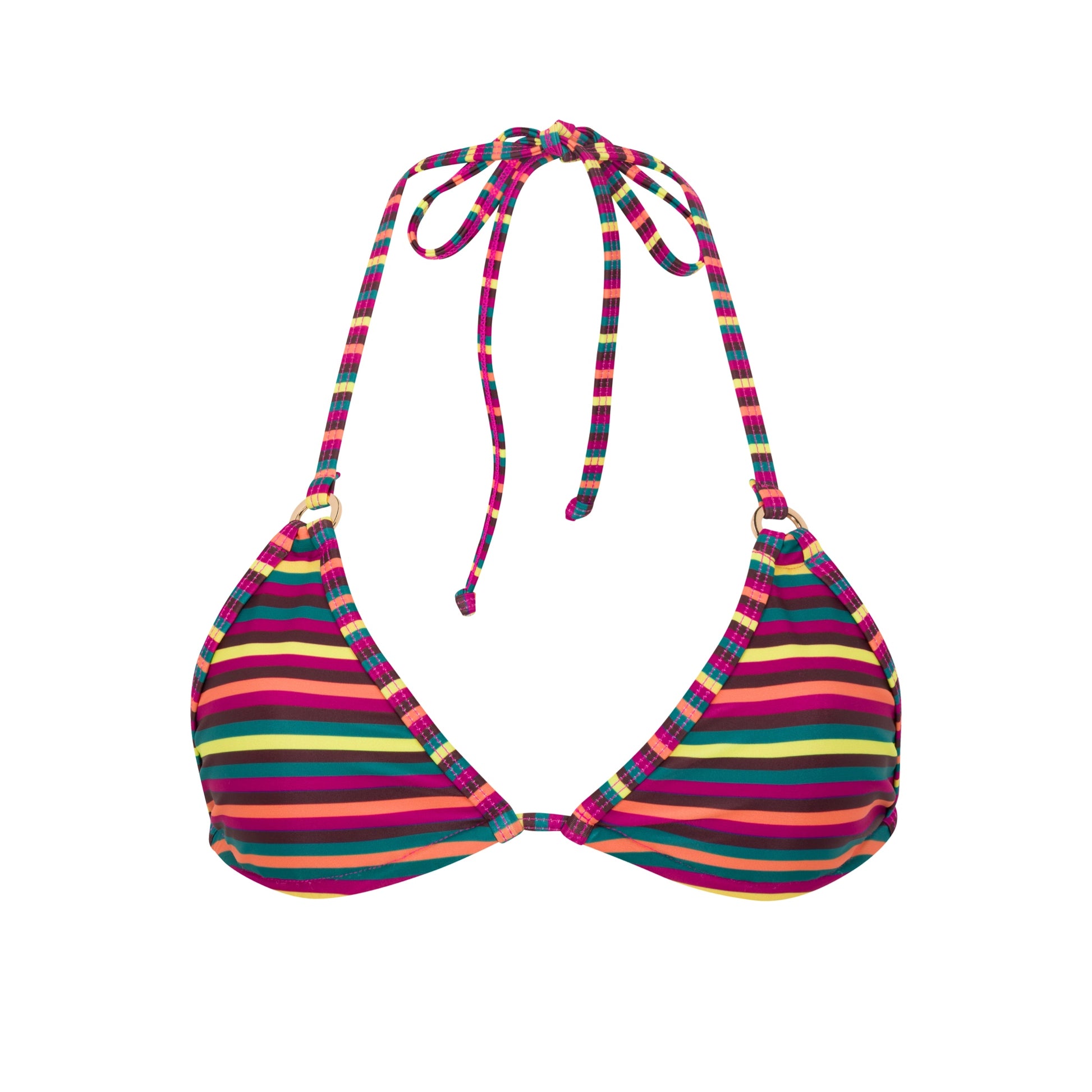 The Retro Triangle Top features vibrant Technicolor stripes and gold ring accents. Designed for minimal tan lines and maximum glow — a classic fit with an electric twist.